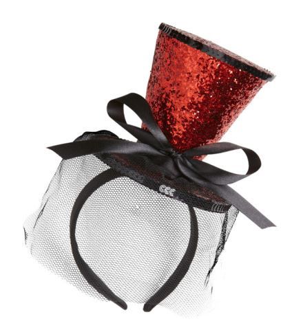 Cepure Mini Cilindrs sarkana ar spīdumiem/banti/plīvuru