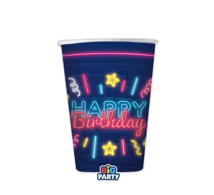 Glāzes Happy Birthday Neon 250ml 1/6gab papīra